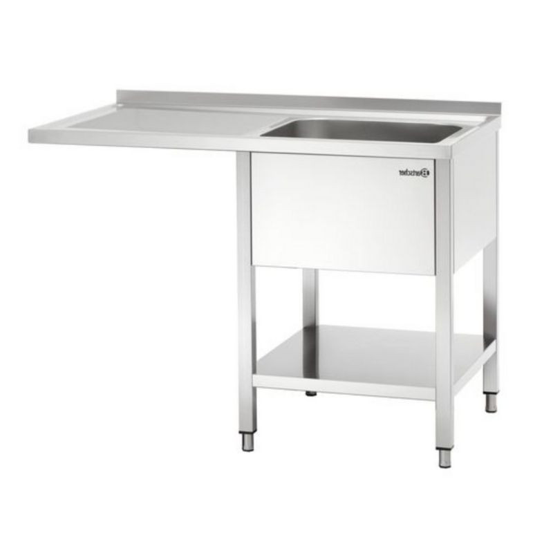 Denna diskbänk tvättstuga med en djup på 700 mm är idealisk för restaurangproffs och sektorn för hotell och restaurang. Den är utrustad med två hoar och en avrinningsbrunn som är placerad till höger. Tillverkad i rostfritt stål med Scotch-Brite-finish, den har också en 40 mm hög stänkskydd och en låg hylla.