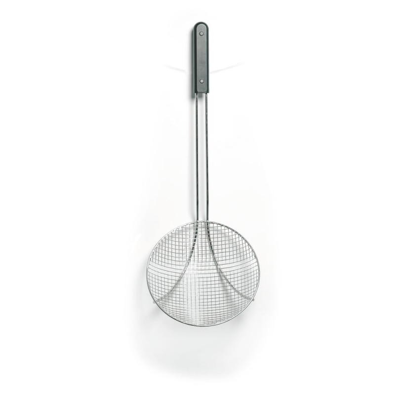 Skimmers med tråd i rostfritt stål från Lacor med en diameter på 20 cm och en längd på 58 cm. Denna redskap är oumbärlig för kokning i kokande vatten eller fritering. Det gör det möjligt för dig att hantera livsmedel på ett säkert sätt, utan att bränna dig.